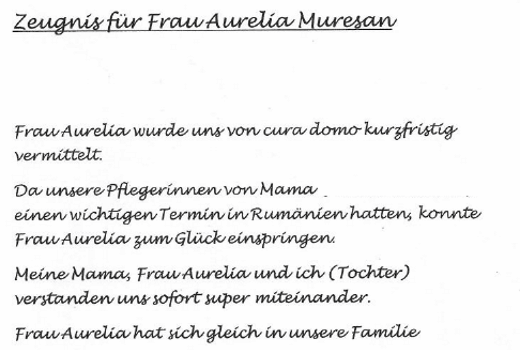 Frau Aurelia wurde uns von cura domo kurzfristig vermittelt.Da unsere Pflegerinnen von Mama einen wichtigen Termin in Rumänien hatten. konnte