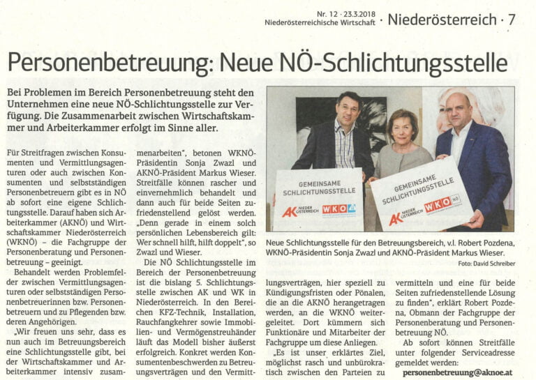 Der ORF Niederösterreich berichtet ebenfalls über die Einrichtung einer Schlichtungsstelle für Streitfragen zwischen Vermittlungsagenturen und Pflegebedürftigen. Wir von cura domo begrüßen